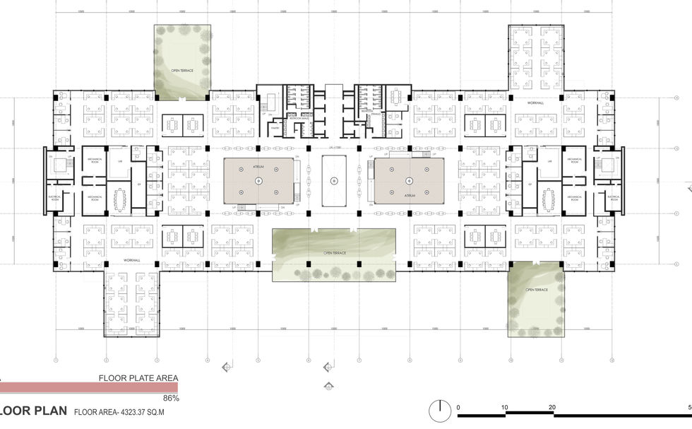 About 40% of the total site is covered with green collaboration areas to reduce the sun reflections and radiation. Also, these collaboration areas caters the social life among the employees working here. Employees can interact among themselves here, play sports for recreational purposes to release stress due to work.