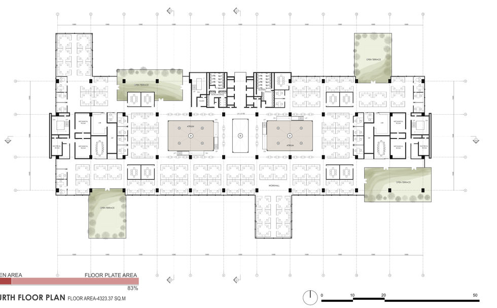 Structure of the building is compared to a tree as; the basement is root where main service functioning takes place, the cantilever act as branches to take in natural sunlight and finally the bio wall acts leaves foliage that are also prevents heat to enter and regulates temperature within the building.